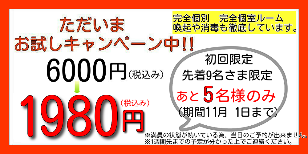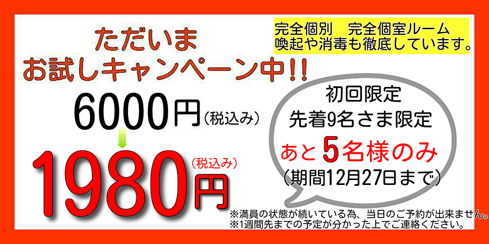 ※大変申し訳ありませんが、先着9名様以降のご予約は通常料金6,000円を頂戴させていただきますので、初回特典割引をご希望の方は今すぐ下記のメールお問合せフォームもしくはお電話よりおはよー整体院までご予約のお電話またはメールをください。